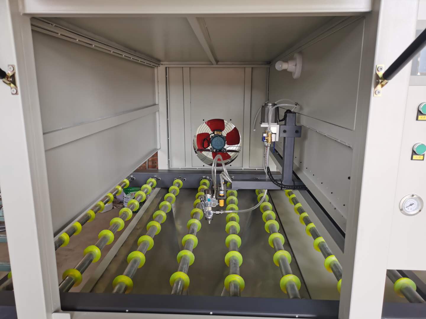 9.設(shè)備為外接式風(fēng)機(jī),所有漆霧都過濾排放,本機(jī)是集清潔、噴淋滴一體的智能型機(jī)器,工作無(wú)污染,